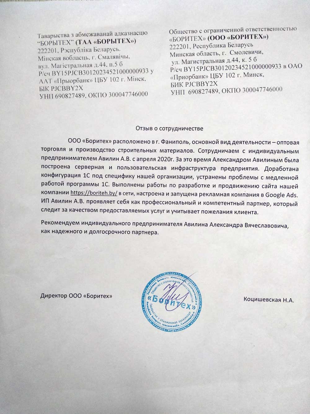 Описание: Основной вид деятельности ООО "Боритех" является производство бетонных изделий. Выполнены комплексные работы по управлению информационными технологиями предприятия - доработка 1С:Бухгалтерия, разработка, продвижение и оптимизация сайта организации, контекстная реклама.