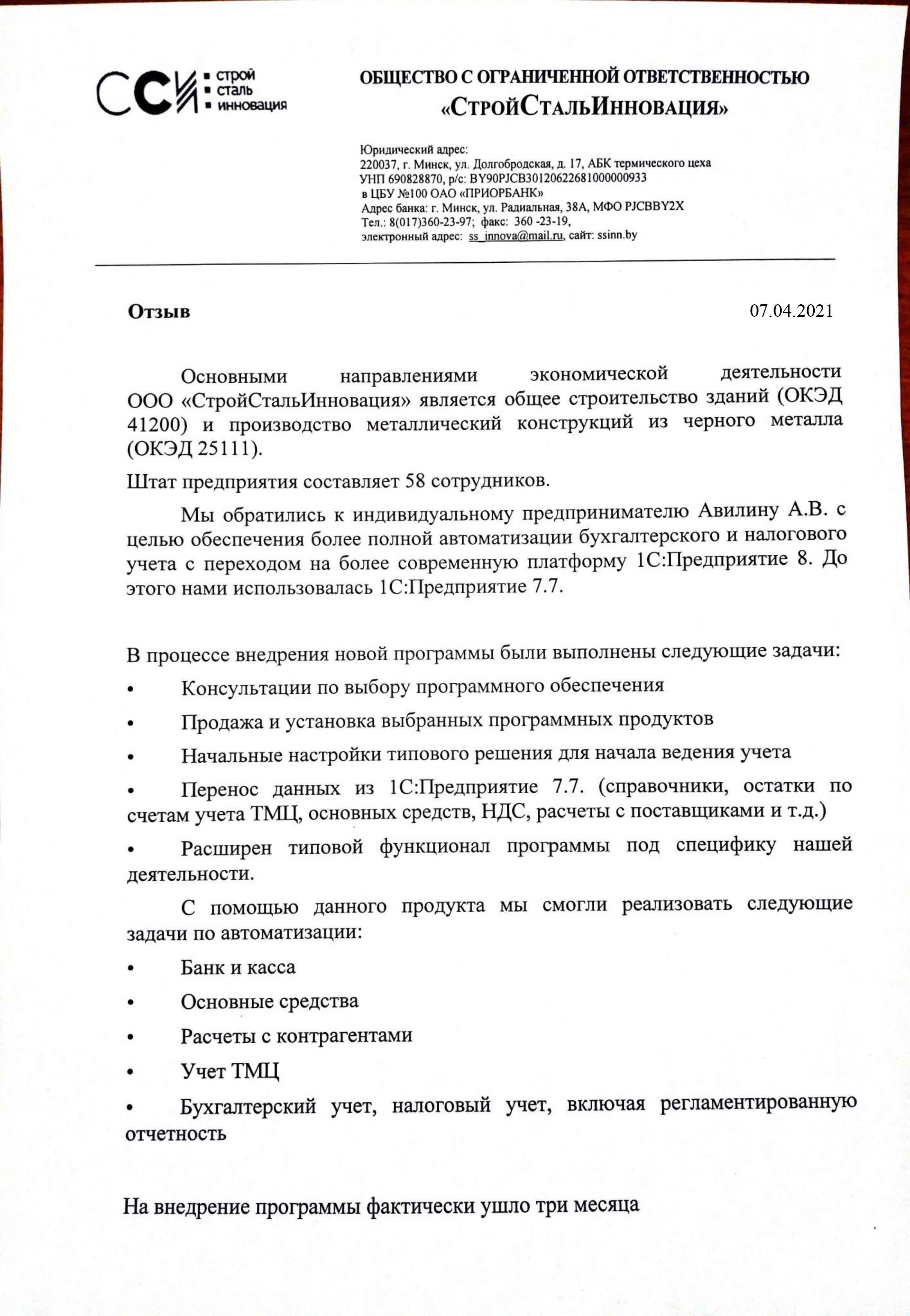 Описание: Основной вид деятельности ООО "СтройСтальИнновация" является общее строительство зданий и производство металлических конструкций из черного металла. В процессе внедрения был осуществлен переход (с 1С7.7) и адаптация программы 1С:Бухгалтерия 8 для Беларуси. Разработаны (добавлены) новые инструменты автоматизации к типовому решению под специфику деятельности организации.