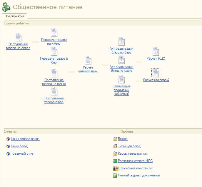 Автоматизированы такие участки общепита как: поступление продуктов на производство и розничную торговлю, переоценка, инвентаризация, составление и расчет калькуляционных и технологических карт, расчет НДС и наценки на реализованный товар.