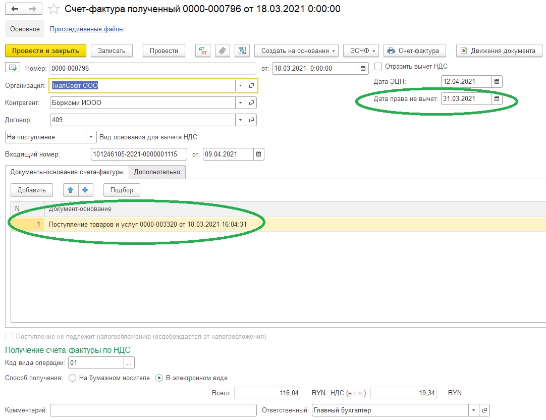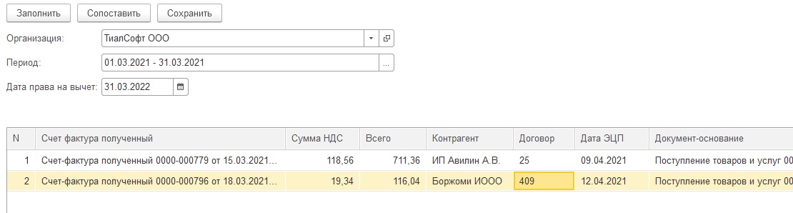 - Автоматическое заполнение (подстановка) документов поступления и установка дата права на вычет в ЭСЧФ;