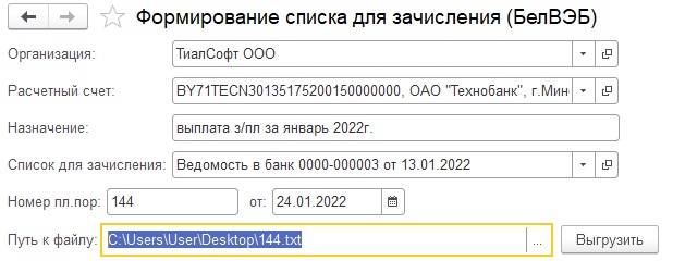 Модуль предназначен для выгрузки в клиент банк перечня сотрудников и суммы перечислений по каждому из них.
